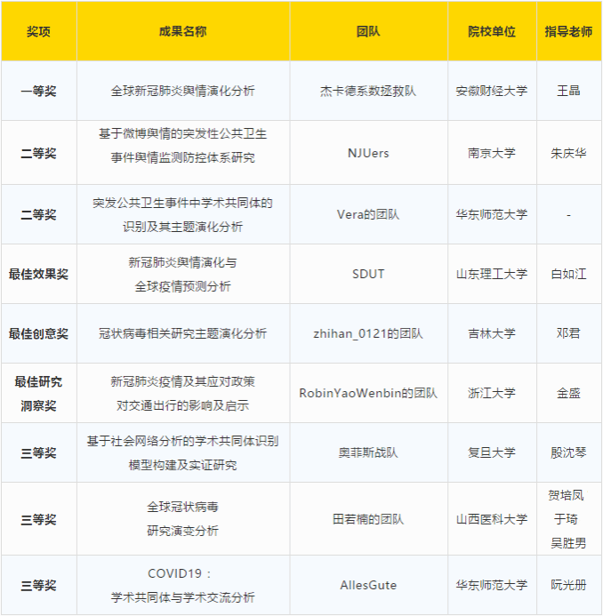 该数据竞赛围绕COVID-19疫情相关的舆情以及大数据,设置多个热门议题,鼓励高校师生及社会人士结合专业知识、针对疫情相关议题进行数据的深入分析和研究,旨在对舆情演化、公共卫生事件应对、学术共同体发现等问题领域做出创新型的突破,对疫情防控、学科研究与专业知识应用、数据思维培养具有重大意义。该数据竞赛共设置一、二、三等奖分别为1、2、3个,另外还设置了最佳创意奖等单项奖3项。