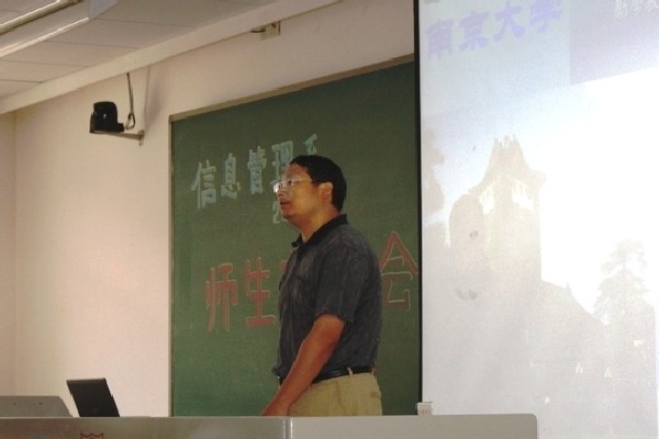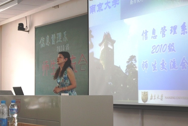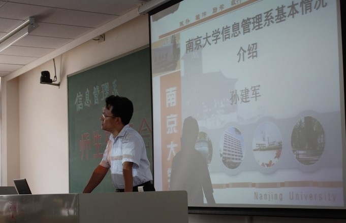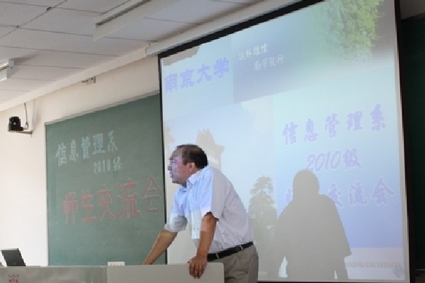 信息管理系的发展历程、学科发展、师资队伍、人才培养、教学环境等方面的情况,而后提出了对新同学大学学习生活的期待——DIY(Do it yourself),具体分解为自我剖析、自我设计、自我体验、自我负责四个阶段,并衷心祝愿新同学通过这四个阶段的自我塑造成长为“具有国际化视野,善于多元化交流,人格完善、专业精通的优秀人才”。江莹书记建议新同学不仅要在南大求知、求学,也要学会做人、做事,应该发扬中国传统文化中的优良品德,心存感恩和责任,待学有所成后不忘回馈奉献。同时江书记向同学们保证学校和院系一定尽力为大家的成长和发展提供良好的条件。吴建华副主任为新同学剖析了中学和大学的区别,强调了自我管理能力在大学学习生活中的重要性,并对大家提出了四点要求“定位准确、主动接轨、注重能力、发展多元”。戴咏梅副书记承接吴建华副主任的主题进一步分析了大学学习生活的特点,希望新同学认真思考大学阶段的奋斗目标并敢于展示自我。
