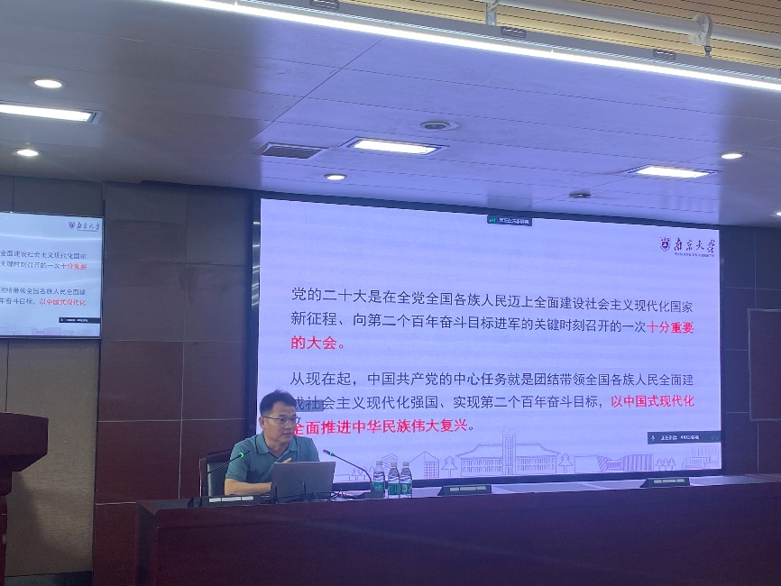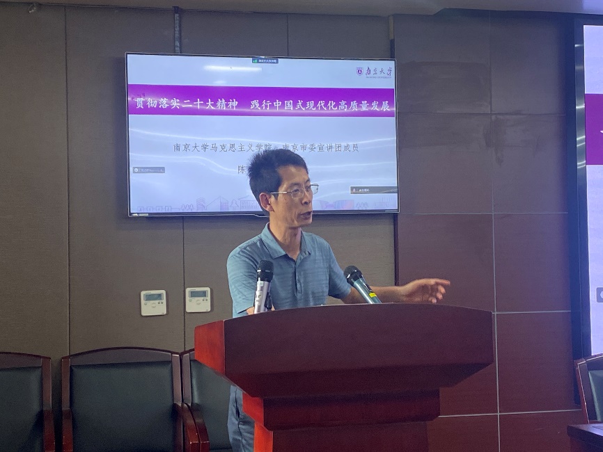 马克思主义学院副院长、南京市委宣讲团成员陈建以“贯彻落实二十大精神 践行中国式现代化高质量发展”为题作专题辅导报告。院党委书记马进军主持培训并作总结讲话。全院400多名师生党员参加培训。