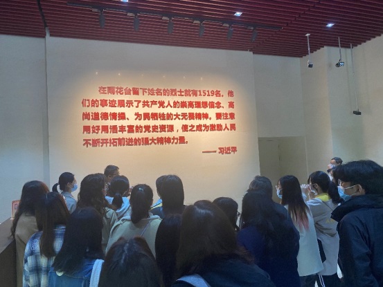 师生们首先进入雨花台纪念馆,在闻慧斌同志生动详细而又专业深入的讲解下,师生们认真了解了雨花台烈士的生平事迹,沉浸在深深的震撼和无尽的哀思中,一个个壮怀激烈的英烈故事,引领着同学们真切感受什么是信仰的力量,什么是舍小家保大家,什么是舍生取义、正义长存。