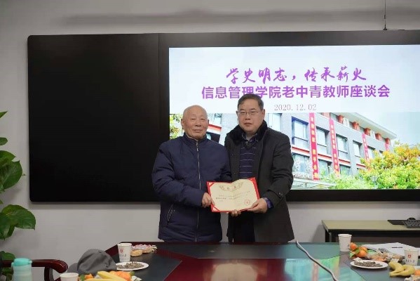举办了以“学史明志,传承薪火”为主题的老中青教师座谈会。从50后到90后,十余位成长工作于不同年代的信管人欢聚一堂,共话学院发展。座谈会上同时举行了“学院青年教师成长导师”聘任仪式。