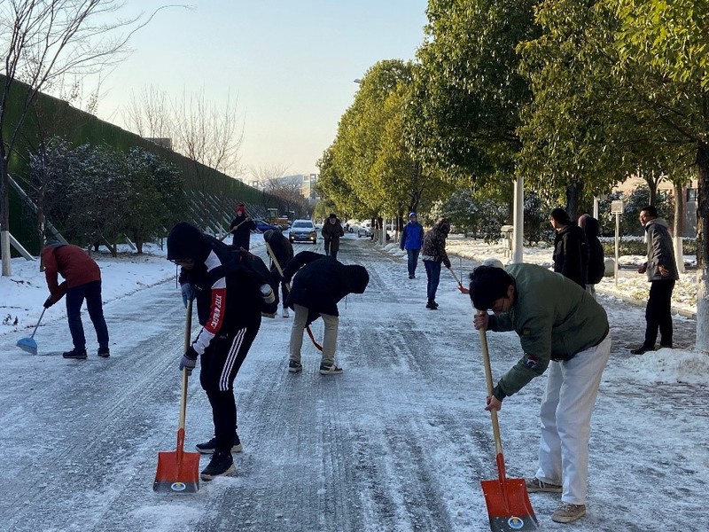 老师的带领下、学校后勤集团的协助下,同学们拿起扫帚、铁锹和推雪铲到指定区域扫雪。尽管天气寒冷,寒风肆虐,但依然挡不住老师和同学们的热情。