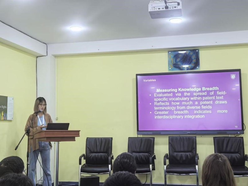 在科学计量与信息计量领域的最新进展。其中,博士后石静汇报了与陈烨助理教授合作的论文,题为“Balancing Accuracy and Explainability: An Ensemble-KAN Model for Patent Grant Prediction”,提出一种兼顾预测准确性与可解释性的专利授权预测模型,基于多领域数据进行实证分析,为可解释性模型在专利计量领域的应用拓展提供了有益实践与理论启示。博士生王嘉杰汇报了与硕士生程晓灵合作的论文,题为“Network Position Matters: Collaborative Strategies, Talent Mobility, and Exploratory Innovation in Teams”,探讨团队合作网络中的成员位置如何在人才流动背景下影响探索式创新行为,深化了对协作创新机制的理解。博士生杨杰在AII-EEKE工作坊线上汇报了与邓三鸿教授等合作的工作论文(线上),题为“Measuring Technology Diffusion Dynamics Using Patent Full-Text Data and Machine Learning”,探索了如何基于PatentBERT等机器学习模型来量化技术创新和动态扩散。博士生李悦报告了与康乐乐教授合作的论文,题为“Unveiling the Temporal Dynamics: The Impact of Knowledge Source Diversity, Breadth and Depth on Disruptive Innovation through Time-Series Analysis”,通过构建时间序列分析框架,揭示了知识来源的多样性、广度与深度对颠覆性创新的影响路径,为理解知识结构演化与高影响力创新之间的关系提供了理论参考。博士生林定康作报告“How is the Sino-US AI Collaboration Reshaped by the China Initiative?”,聚焦中美人工智能合作网络的结构变迁,系统分析了政策冲击对国际科研协作格局的影响。
