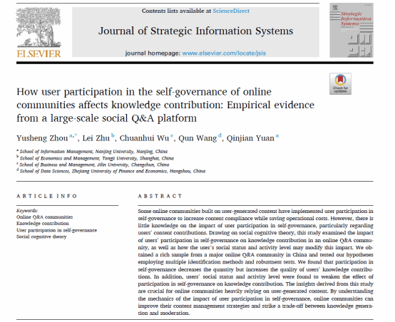 周宇生博士作为第一作者(指导老师为袁勤俭教授)的研究成果“How user participation in the self-governance of online communities affects knowledge contribution: Empirical evidence from a large-scale social Q&A platform”,在信息系统国际著名期刊《Journal of Strategic Information Systems》(中科院一区Top期刊,JCR一区:Information Science & Library Science类别排名2/161;Computer Science & Information Systems类别排名6/250;Management类别排名21/407,影响因子8.7)。此文的三位合作者分别是同济大学朱磊博士、吉林大学吴川徽博士以及浙江财经大学王群博士。