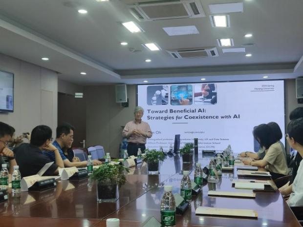 在第二场讲座中, Sam Oh教授做题为人机共生时代:以人为本的人工智能共存策略(Towards Beneficial AI: Strategies for Coexistence with Human-Centered AI)的分享,本次报告深入探讨了人工智能(AI)时代人类与AI共存的策略,以及教育在这一过程中的关键作用。Sam Oh教授指出,人类历史是信息发展的历史,而AI的出现是人类在信息积累和处理技术发展过程中的重要里程碑。Sam Oh教授认为AI的发展应当服务于使“人类生活得更好”,并强调人类的选择和决策将塑造未来的方向。