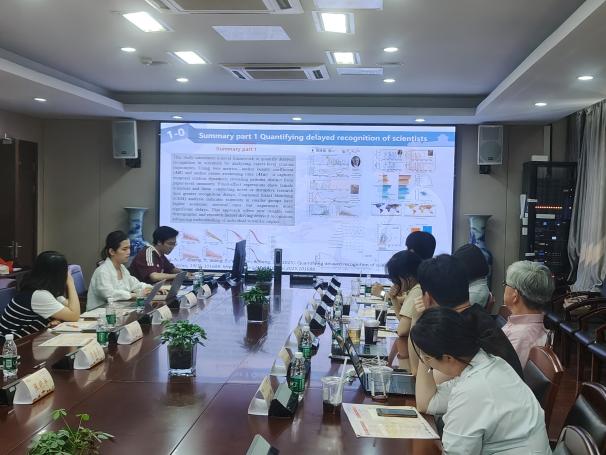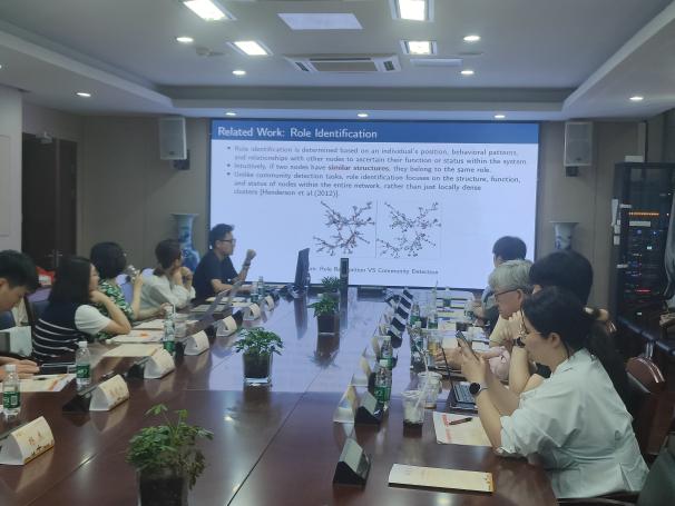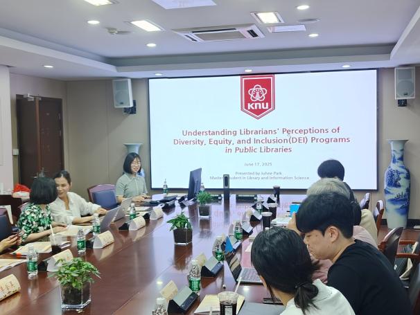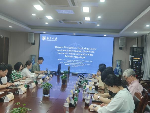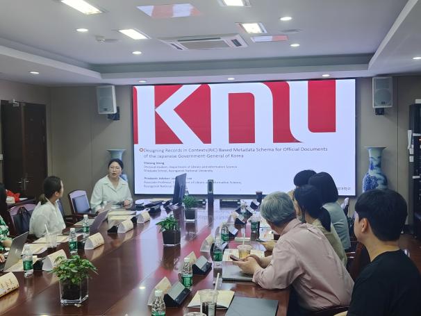 的研究生李金昊、张晓宇、杨杰以及王佳鑫分别进行研究展示,双方就信息组织、图书馆发展、信息素养、档案建设等多个研究问题进行深入的交流探讨。