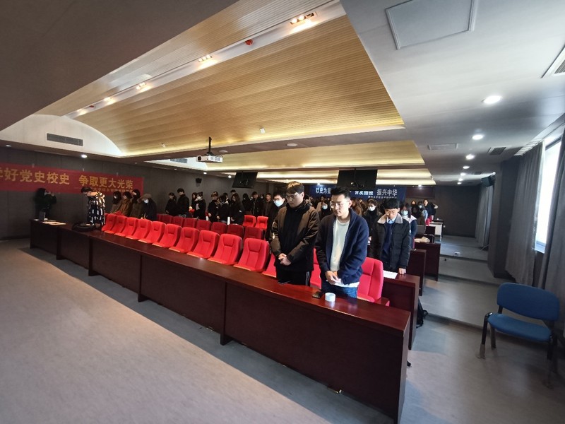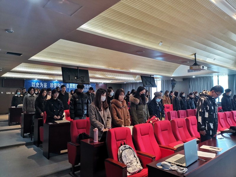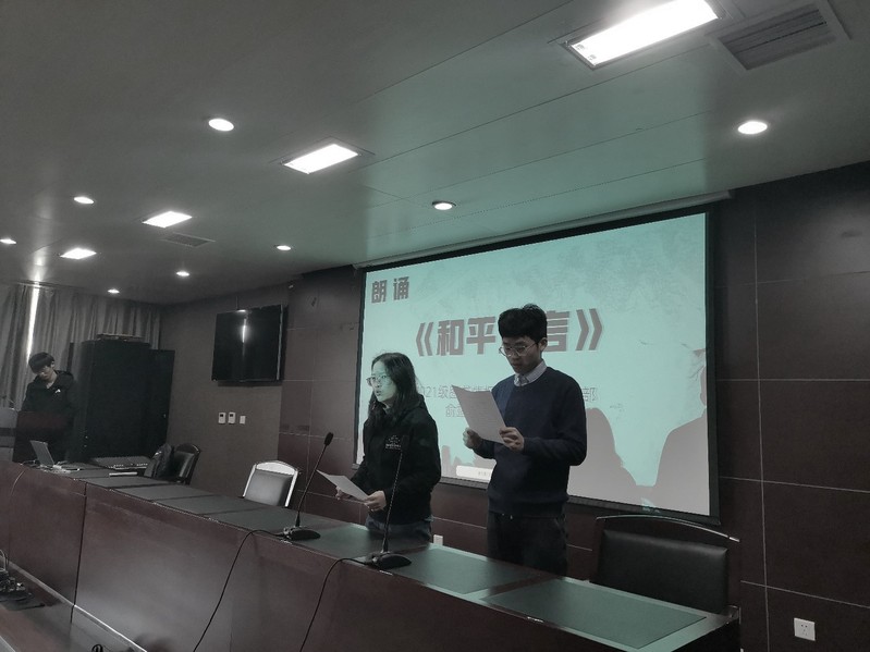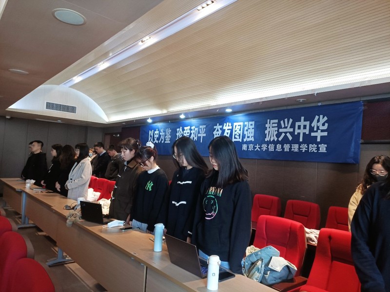 默哀式结束后,2021级图书情报硕士第二党支部的俞露露、徐建国同志朗诵了《和平宣言》。“巍巍金陵,滔滔大江,钟山花雨,千秋芬芳。一九三七,祸从天降,一二一三,古城沦丧。”每一句铿锵有力的诵读,都穿透时光的疮痍,警醒同志们彝训鼎铭,永志不忘。