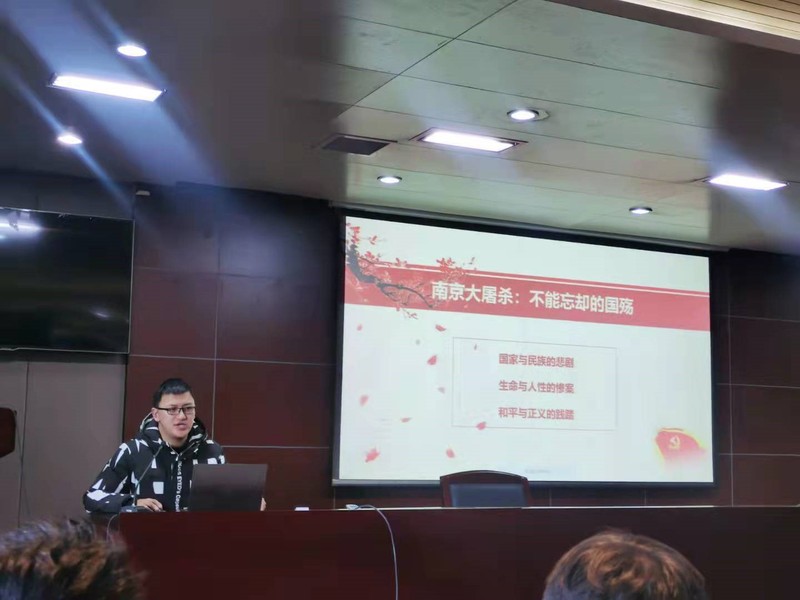 接着,历史学院2020级中国史党支部书记王雪琦同志带来“诚寄哀思,开创未来”专题分享。他从淞沪会战后中日双方作战计划、南京保卫战双方装备配置等多方面讲述了南京沦陷、南京大屠杀的起因经过。并提到,长期以来都存在着关于南京大屠杀的“否认事实说”、“为之辩解说”的极端错误观点,所以国家才会设立国家公祭日,以正视听,把对南京大屠杀死难者的祭奠从人民群众自身的精神诉求上升为国家的集体意志。只有这样永远记忆,永志不忘,我们才能真正告慰那些死难者。只有永远铭记过去的苦难,才能深刻理解和平的来之不易,从而更加珍惜今天的和平生活。最后他引用南开大学教授艾跃进的话——在国际交往中,实力永远是维护正义的基础,国防才是外交真正的后盾,尊严只在剑锋之上,真理只在大炮射程之内,呼吁同学们以史为鉴,开创未来,坚持党的领导,走好新时代的长征路、赶考路。